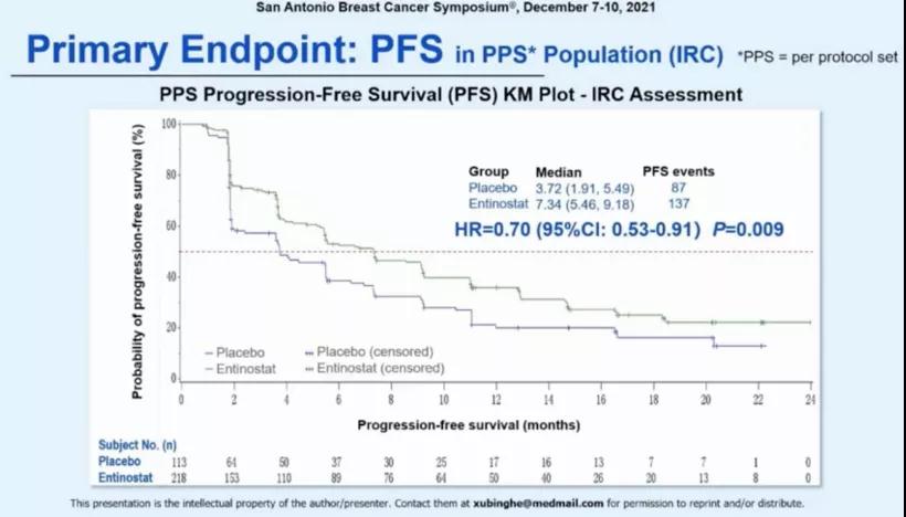 研究于2019年4月16日~2020年5月13日期间共入组354例患者,其中235例随机分入entinostat组,119例分入安慰剂组,IRC评估的两组中位PFS分别为6.32个月(95% CI:5.30~9.11)和3.72个月(95% CI:1.91~5.49),HR=0.74(95% CI:0.57~0.96, P<0.001)。