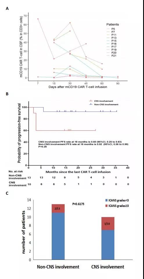 6例CNS受累患者在最后一次CART细胞输注后获得持续CR,10例中枢受累患者预期在最后1次CART细胞回输18个月PFS为60% (95% CI, 25 to 83)。13例非中枢神经系统受累患者中4例接受2周期CAR-T治疗,3例接受3周期CAR-T治疗,1例接受4周期CAR-T治疗,12例患者在最后一次CART细胞输注后获得持续CR,18个月PFS为92%(95% CI, 56 to 99)。中枢受累组与非中枢受累组的18个月PFS无显著差异。