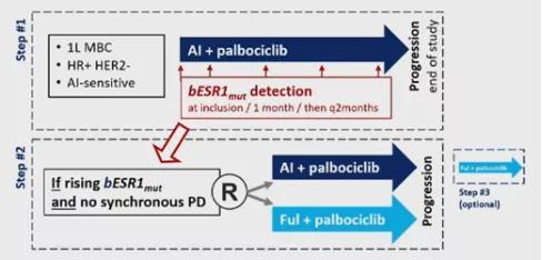 研究共有3个阶段:第1阶段,定期进行cfDNA分析,评估入组患者基线及PAL+AI治疗中的ESR1突变情况(入组时、1个月时、随后每2个月检测1次);若检测出ESR1突变且疾病还未进展的患者,纳入第2阶段,随机接受PAL+AI继续治疗(标准组),或PAL+Ful转换治疗(试验组)。对于标准组,若发生疾病进展可选择交叉应用PAL+Ful,进入第3阶段。第二阶段研究者评估的PFS、以及安全性为本研究的共同主要主终点。继2020ASCO大会公布了第1阶段的结果以后,本次圣安东尼奥大会公布了第2阶段即主要研究终点的结果(GS3-05)。