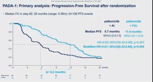 ◆ 研究结果: 在2017年3月至2019年1月期间,第1阶段共纳入1017名患者。其中172名检测出bESR1m同时无疾病进展的患者被随机分配到继续PAL+AI组(N=84)或PAL+Ful组(N=88)。在172名随机患者中,中位随访26个月后,共观察到136例PFS事件。PAL+AI组的中位PFS为5.7个月(95%CI:3.9~7.5),PAL+Ful组的中位PFS为11.9个月(95%CI:9.1~13.6),(HR=0.63;95%CI:0.45~0.88,p=0.007)。两组间无新的安全性信号发生。