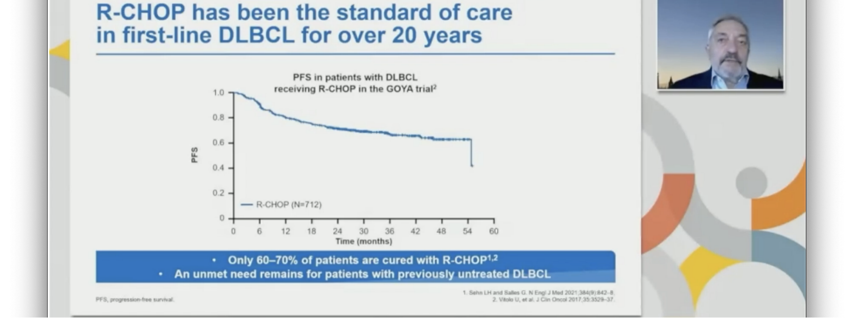 该项研究针对的是我们常见的DLBCL的一线治疗。众所周知,DLBCL的异质性很强,可以说是一组疾病。在20多年的治疗实践当中,目前我们已经总结出了它的标准治疗方案,即R-CHOP方案,这也成为DLBCL一线治疗的标杆。该方案能让60%的患者得到治愈,仍然有30%-40%的患者因原发耐药、治疗有效以后的进展复发而成为难治复发的患者,如何能够减少这部分患者的比例,进一步提高一线治疗的治愈率,也成为我们近十几年全球很关注的热点。