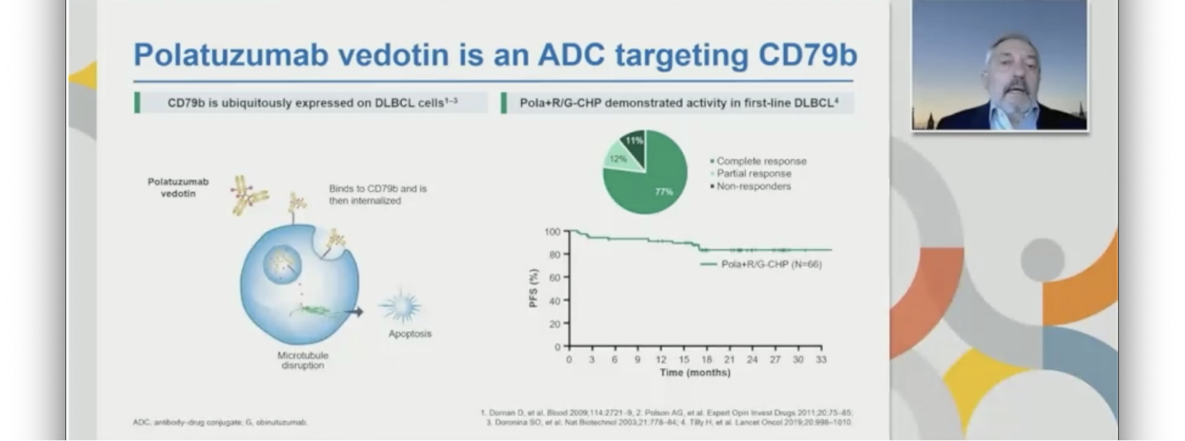该项研究的核心就是对照R-CHOP标准治疗,联合一个新的药物 “Pola”。Pola是一种新兴的抗体偶联药物(antibody-drug conjugate,ADC),在2019年欧美批了用于复发难治性DLBCL的治疗。它兼具了免疫治疗和化疗药物两方面的作用:它的免疫治疗靶点——CD79b,它在B细胞肿瘤表达率达96%以上,因此Pola的靶向作用更加“精准”,可作为绝大多数B细胞肿瘤患者的一个治疗选择。其次,偶联的甲基澳瑞他汀(MMAE)为一种抗微管药物,通过抗体结合下的精准定位,可直达肿瘤细胞,因此对于淋巴瘤的“杀伤力”较其他的纯免疫治疗、小分子的靶向药物的靶向性更强。Pola在2线、3线的治疗当中已经得到证实,也获得了批准,能否在一线治疗当中获得成功我们比较关注。