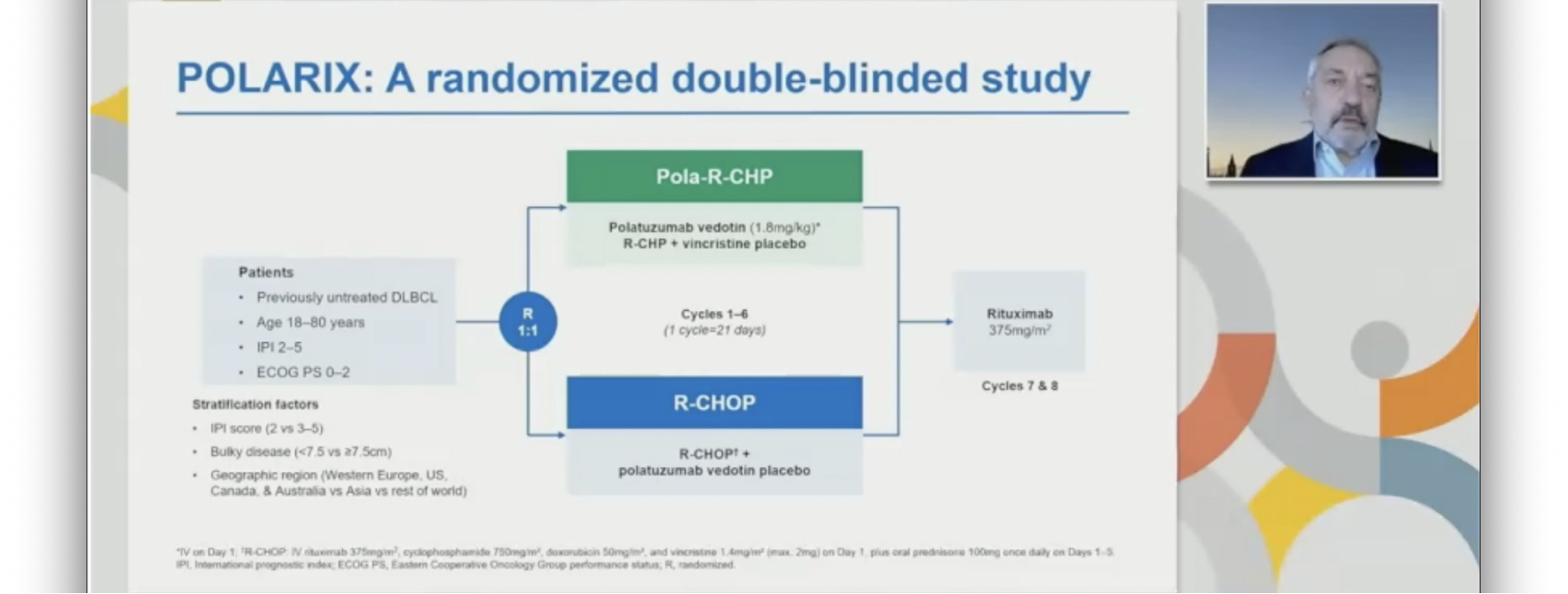 目前对新诊断的DLBCL患者的标准治疗方案是R-CHOP;然而,大约40%的患者没有治愈。CD79b靶向抗体-药物结合物polatuzumab-vedotin(以下简称pola)与苯达莫司汀和利妥昔单抗联合应用于复发/难治性DLBCL已获得批准,并且与利妥昔单抗、环磷酰胺、阿霉素和强的松(pola-R-CHP)联合应用时,也显示出良好的一线活性和安全性(Tilly et al,Lancet Oncol 2019)。因此,在III期POLARIX研究中,我们比较了先前未经治疗的DLBCL患者的pola-R-CHP和R-CHOP。