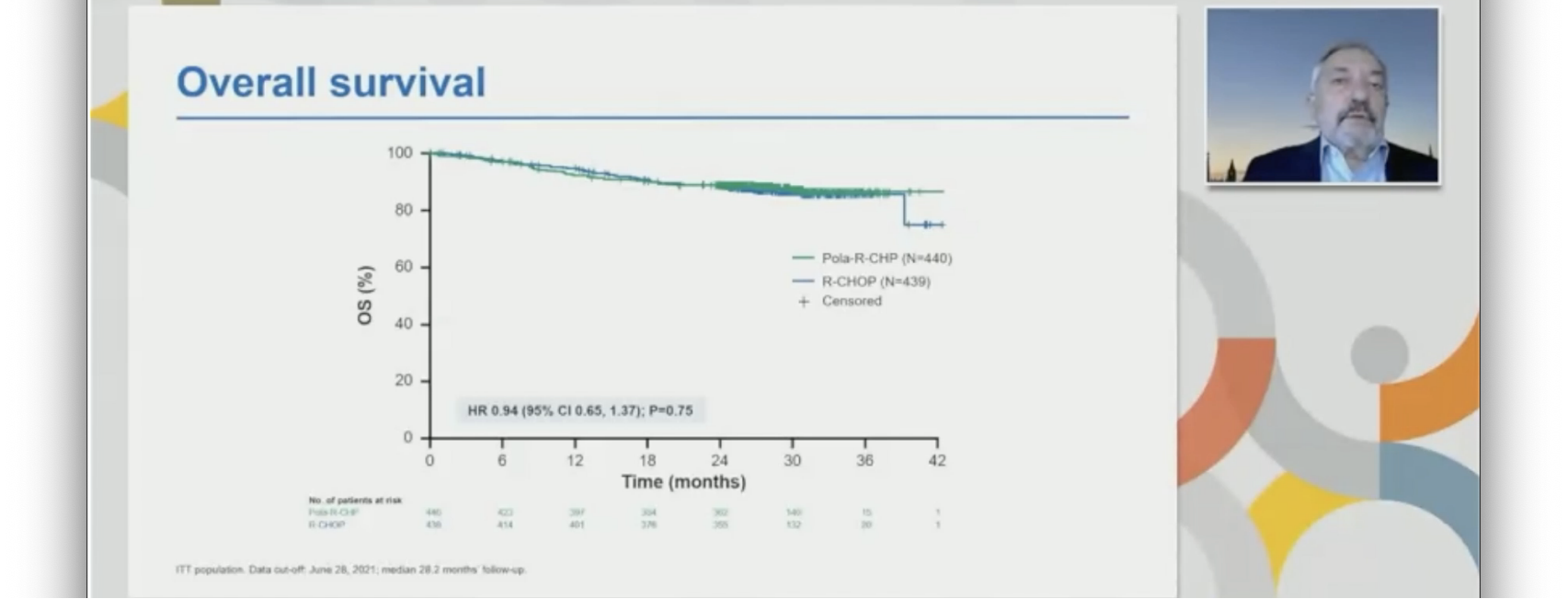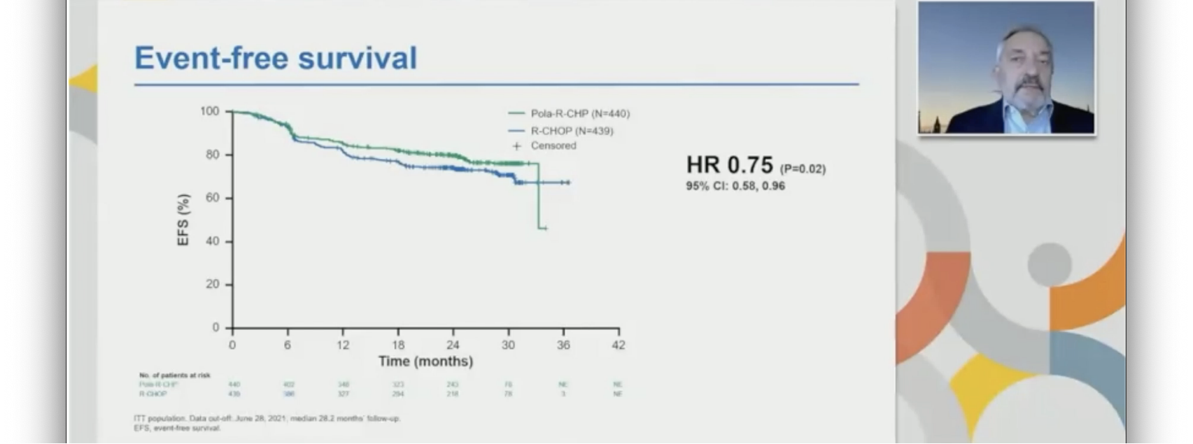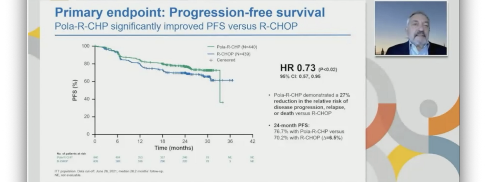 879名患者被随机分组,440名接受pola-R-CHP,439名接受R-CHOP。中位年龄为65岁(19-80岁),大多数患者的IPI为3-5(62.0%)。在2021年6月28日的数据截止后,中位随访28.2个月,pola-R-CHP组PFS显著优于R-CHOP(HR=0.73;95% CI:0.57~0.95;P<0.02),EFS也显著优于R-CHOP组(HR 0.75;95%可信区间:0.58–0.96;P=0.02),DFS较R-CHOP组更持久(HR=0.70;95%CI:0.50-0.98)。不过,pola-R-CHP组的2年PFS发生率为76.7%(95%CI:72.7%-80.8%),而R-CHOP组为70.2%(95%CI:65.8%-74.6%);两组治疗结束时PET-CT CR无显著差异(78.0% vs. 74.0%;P=0.16)。两组之间的OS无差异(HR=0.94;95%CI:0.65-1.37;P=0.75)。