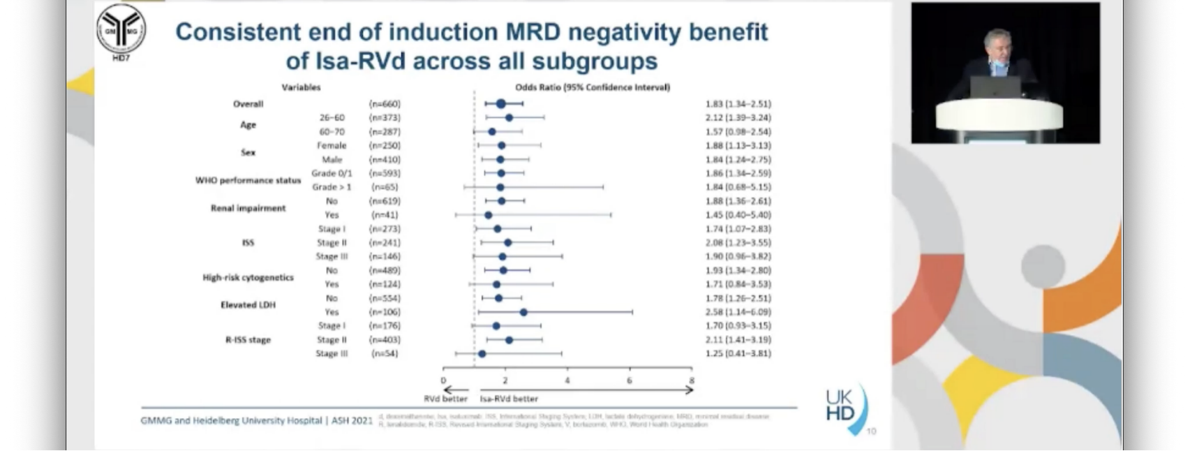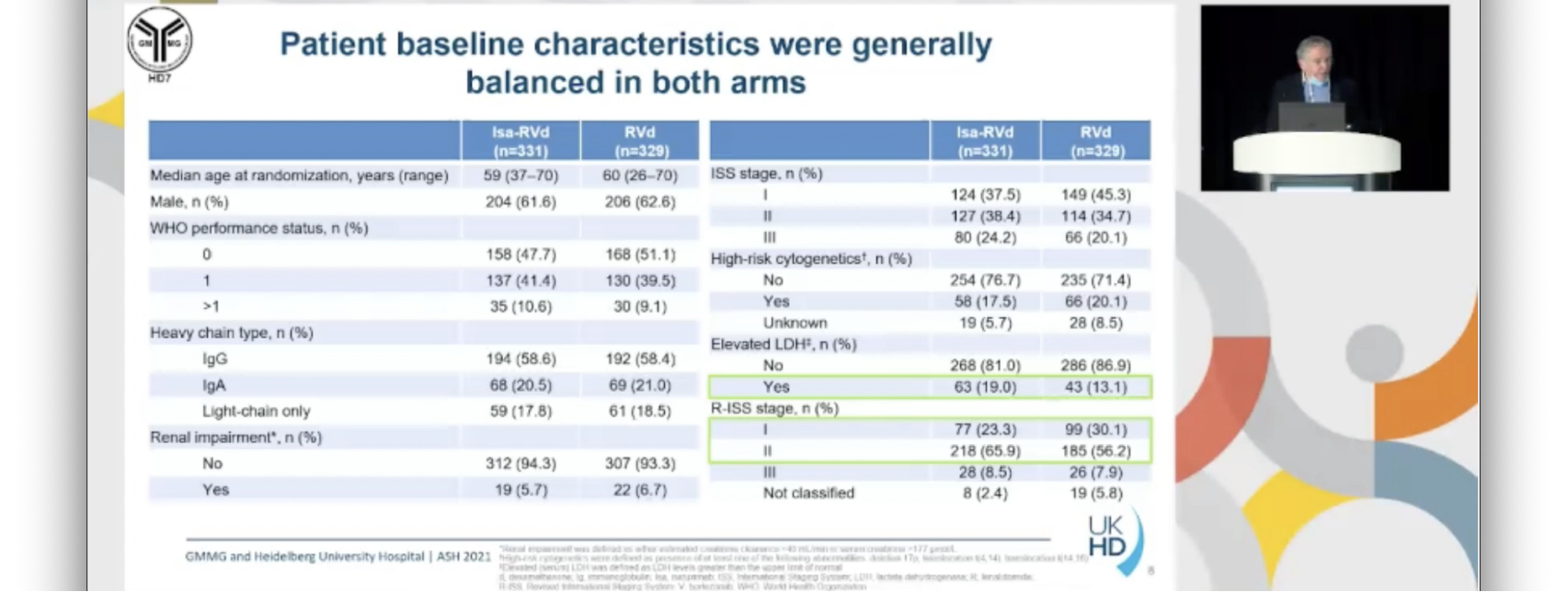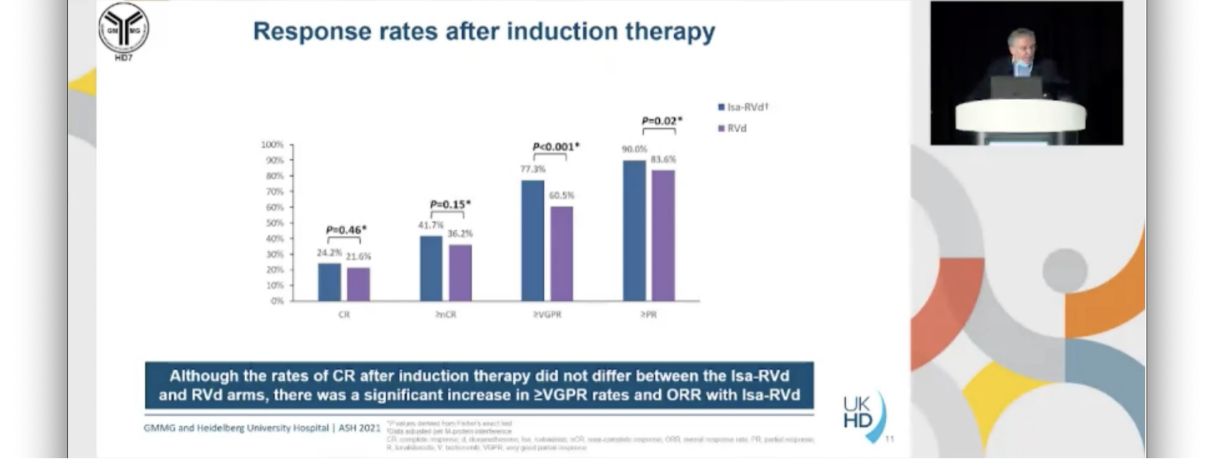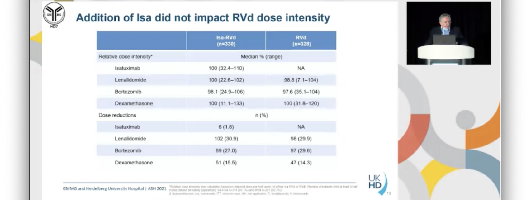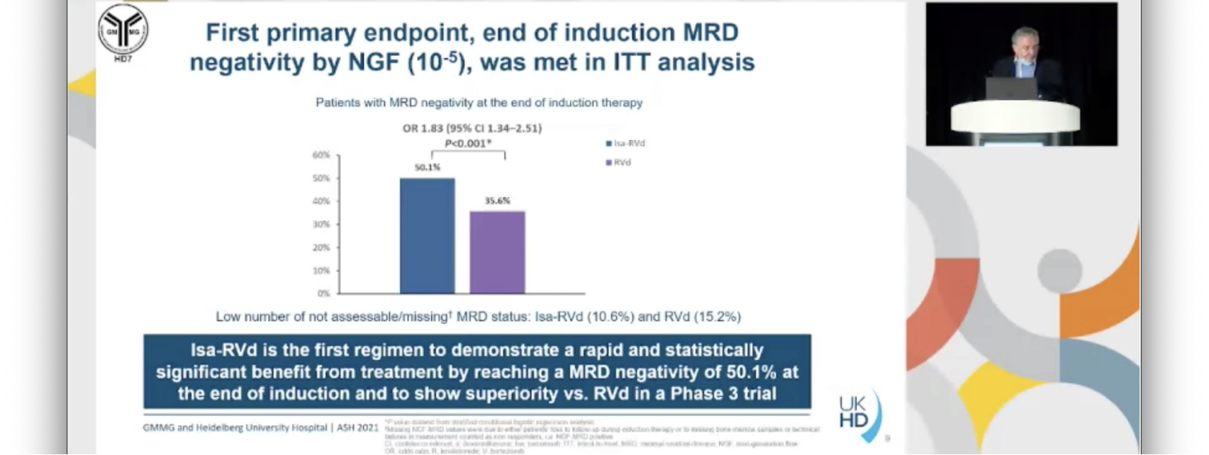GMMG-HD7研究达到主要终点。据我们所知,这是首个证实RVd+CD38-moAb诱导治疗后MRD阴性率增加的III期临床研究。与RVd相比,Isa-RVd治疗患者的SAE或早期停药率没有增加。