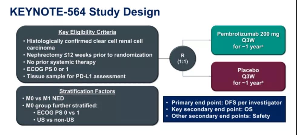 KEYNOTE-564研究是首个证实免疫辅助治疗可改善肾细胞癌患者术后DFS的3期试验。该研究与2017 年 6 月 30 日至 2019 年 9 月 20 日期间招募了 994 名患者,随机分配至 帕博利珠单抗(n = 496)或安慰剂(n = 498)辅助治疗。主要终点是DFS,次要终点包括OS和安全性。