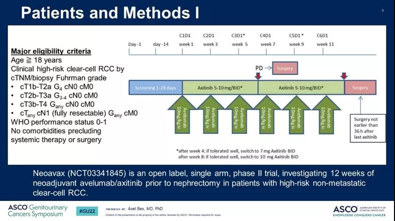 免疫联合靶向药物对于晚期肾透明细胞癌患者取得较高的客观缓解率,因此前移至术前开展新辅助治疗也是目前研究的热点,本次ASCO-GU大会报道了第一个靶免联合新辅助治疗的NeoAvAx研究,这是一项Avelumab联合阿昔替尼用于高危非转移性肾透明细胞癌的II期研究,主要入组患者的分期为临床分期为T1b-T2a且G4、T2b-T3a且G3-4、T3b-T4任意分级以及任意T合并淋巴结转移,术前12周接受阿昔替尼联合Avelumab治疗,研究的主要重点是超过25%的客观有效率,次要终点是DFS,OS和安全性,探索性终点为生物标志物分析。
