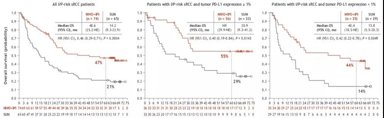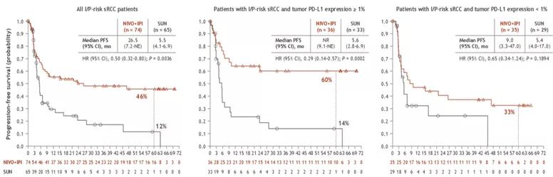 CheckMate214研究在本次会议公布了合并肉瘤样分化患者5年随访结果。试验中合并肉瘤样分化者共139例(N+I,n=74;S,n=65)。N+I组中仍有9例患者在继续接受治疗,S组为0人。N+I组有更高的ORR(61%vs 23%;P<0.0001)和生存获益(OS:49 vs 14月,P=0.0004;PFS:26 vs 5月,P=0.0036。PD-L1≥1%者获益更明显。