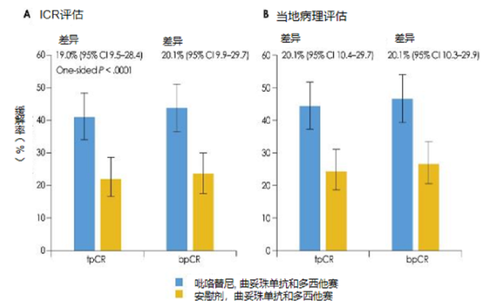 2021年SABCS大会上,吴炅教授汇报的PHEDRA研究是一项旨在评估吡咯替尼或安慰剂+曲妥珠单抗+多西他赛用于HER2阳性乳腺癌新辅助治疗的Ⅲ期试验。该研究结果提示,吡咯替尼组由独立评审委员会评估的tpCR率可较安慰剂组显著提高19%(41.0% vs 22.0%,P<0.001);bpCR率提高20.1%(43.8% vs 23.7%);吡咯替尼组和安慰剂组的ORR则分别高达91.6%和81.9%。吡咯替尼组和安慰剂组的≥3级AE发生率分别为71.3%和37.3%,严重AE发生率分别为14.6%和6.8%。
