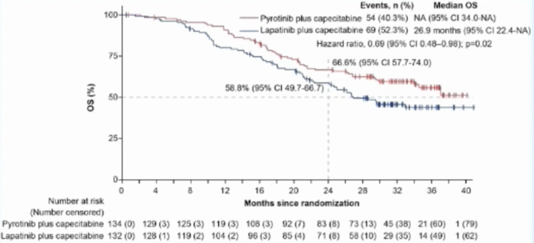 除ADC方面的进展外,TKI在HER2阳性晚期乳腺癌领域也出现了进展。尤其值得指出的是吡咯替尼在PHOEBE研究中总生存数据的公布使我眼前一亮。目前因为事件数的累积还没有到达预期,吡咯替尼组的中位OS尚未达到(95%CI: 34.0~NR),拉帕替尼组中位OS为26.9个月(22.4~NR,HR=0.69,95%CI:0.48~0.98,P=0.019)。这同时也让我们看到了OS获益的希望。二线治疗有了总生存相关的数据,未来值得期待。