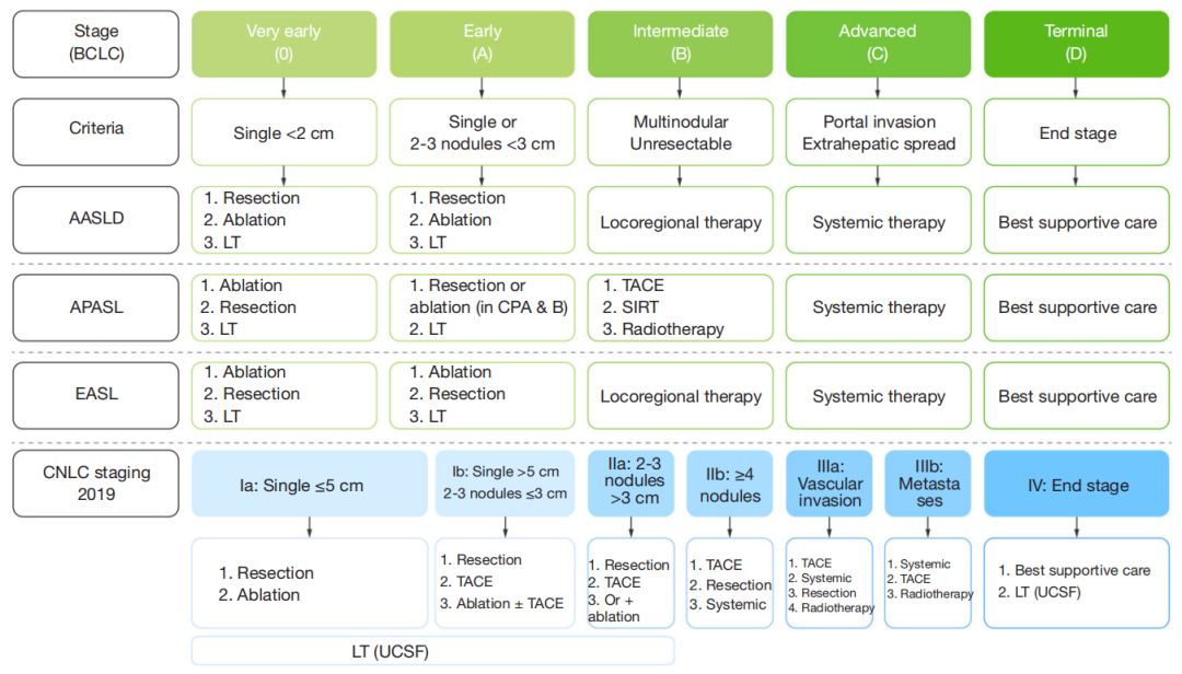 国内外指南对不同分期肝细胞癌的治疗推荐