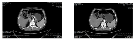 治疗后观察:治疗4周期后,疗效评估cCR;患者无明显发热,体重无明显降低,嗳气、上腹部不适症状好转。胃肠反应Ⅰ度,骨髓抑制Ⅰ度。