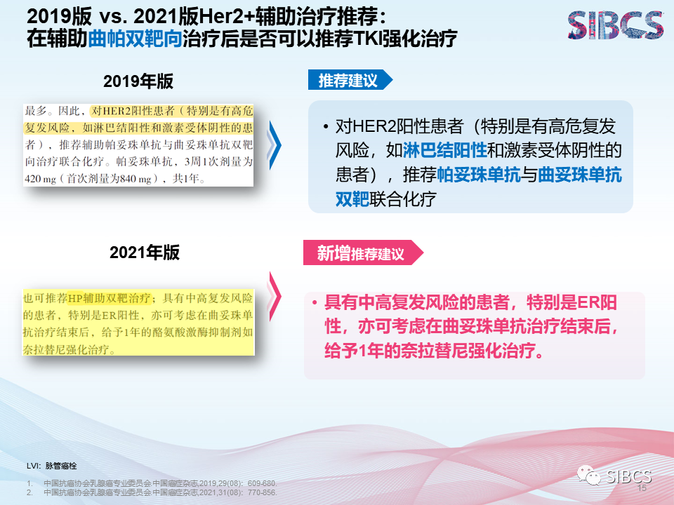 基于APHYNITY的双靶治疗依据是比较充足的。因此,现阶段的强化辅助治疗重点是如何筛选出适合双靶治疗的人群。新版指南对这个问题做出了清晰地阐述,而且区别于St.Gallen的专家投票。我们大致上可以分为两类:一是淋巴结阳性的患者,不管是≥4枚,还是1-3枚,只要淋巴结阳性即可以选择曲帕双靶联合化疗;二是淋巴结阴性但合并有其他高危因素,比如ER/PR阴性而缺乏内分泌治疗靶点,以及Ki-67>30%、G3、肿瘤体积较大(pT2+)、存在脉管癌栓的、年轻(<35岁)的患者,也可以推荐曲帕双靶治疗。此外,新版指南对序贯奈拉替尼的人群比较明确,主要用于中高危尤其是ER阳性的患者。