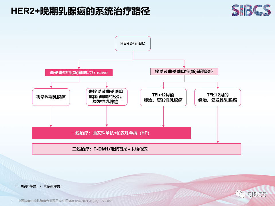 经抗HER2治疗(pretreated)和抗HER2治疗耐药(resistant)在定义上是有区别的,前者是既往接受过抗HER2治疗,有可能是耐药也可能是治疗敏感的。例如,某患者接受过抗HER2(新)辅助治疗,但是在治疗结束1年后发生复发转移,这样的患者仍然属于治疗敏感的,不应当属于严格的抗HER2二线治疗患者。CBCS指南小红书中对晚期HER2阳性乳腺癌的系统治疗路径也对患者进行了不同的治疗分层。