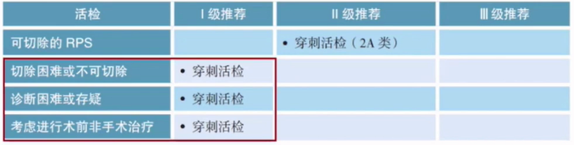 由于RPS的病理类型对于确定适当的手术计划极为重要,除影像学上可以直接判断为可切除的脂肪肉瘤不需要术前进行穿刺活检外,对于其它的腹膜后肿瘤,强烈建议术前进行影像引导下穿刺获取病理诊断,尤其是切除困难或诊断上存在疑问,需要除外淋巴瘤、生殖细胞肿瘤、其它恶性肿瘤伴腹膜后转移,或需要进行转化治疗的患者。明确病理诊断有助于MDT根据肿瘤的组织学类型和分级制定合理的手术方案和综合治疗计划。