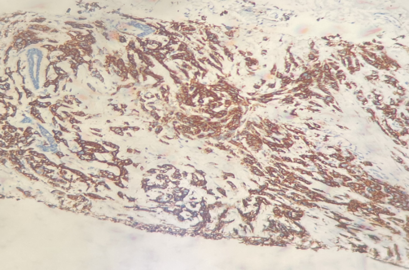 2021年11月3日右乳结节穿刺免疫组化:ER(-,0%),PR(-,0%),HER2(3+),Ki67(+45%)。