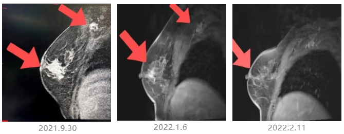 2022年2月11日乳腺MR提示:右侧乳腺肿物较前进一步缩小,边界欠清,原肿物处现仅见点状强化灶,约0.4cm,右腋窝淋巴结现已不具体。