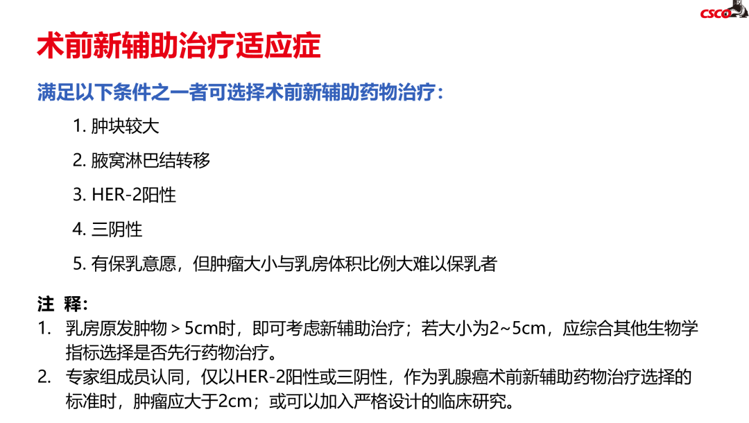 2021年的《ASCO乳腺癌新辅助治疗指南》中将T>1cm的HER2+、三阴乳腺癌作为新辅助治疗的标准,《NCCN乳腺癌指南》2022年第一版也指出这部分患者可以考虑行新辅助治疗。中国专家组更多成员推荐肿瘤应大于2cm;或可以加入严格设计的临床研究。