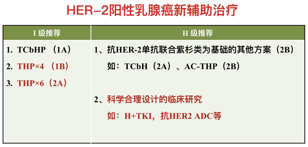 术前抗HER2治疗仅使用曲妥珠单抗,且达pCR的患者,I级推荐为HP双靶治疗,而H单靶治疗调整为II级推荐,主要基于APHINITY研究验证双靶优于单靶,HP的可及性好。