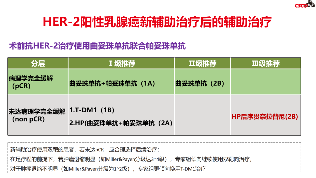 对于未达到pCR患者的术后辅助治疗,目前循证医学证据级别最高的KATHERINE研究,推荐使用T-DM1强化辅助治疗(1B);达到pCR的患者,可以延用新辅助治疗阶段的靶向治疗方案。