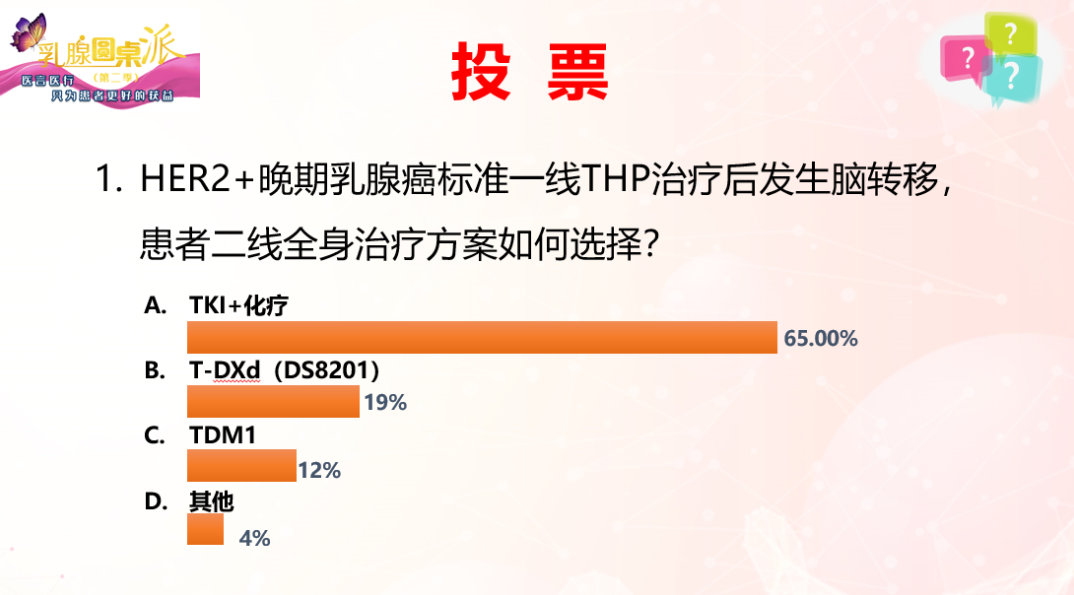 网上医生投票结果揭晓:支持脑转移患者TKI药物经治后将ADC作为首选的网络医生最多,其次为支持稳定性的脑转移患者、只要是HER2+脑转移患者都会考虑、需经过局部放射治疗的患者。