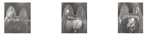 该患者分别于2021-10-15、2021-11-5、2021-12-1、2021-12-22、2022-1-13、2022-2-8完成6周期新辅助化疗,方案:TCbHP,紫杉醇脂质体210mg+卡铂 0.6g+汉曲优(首次剂量 500mg,维持剂量380mg)+帕妥珠单抗(首次剂量 840mg,维持剂量420mg),该患者在完成第一周期新辅助化疗后,自觉肿块明显缩小,在行第3周期新辅助化疗入院后,予以完善乳腺MRI提示,乳腺肿物及腋窝淋巴结均明显缩小,查体几乎无法触及乳腺肿物及腋窝肿大淋巴结,继续完成6周期足量新辅助化疗后行乳腺癌改良根治术。