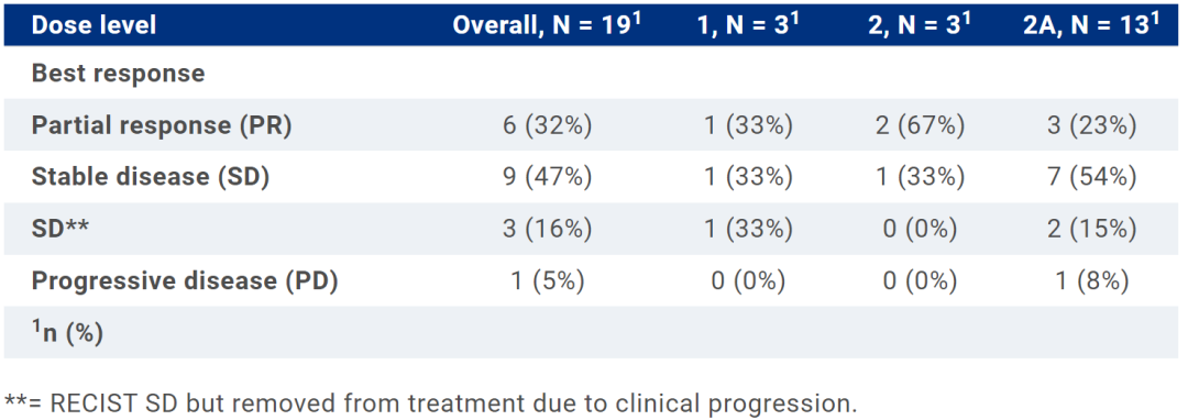 至2022年1月6日数据截止,已有29名LMS患者接受了治疗。既往治疗中位数为3(范围1-6)。在27例可评估患者中,12例为非子宫型,15例为子宫LMS。通过TITE-CRM确定unesbulin的MTD/RP2D为300mg BIW,达卡巴嗪为每21天静脉注射1000mg/m2。在RP2D治疗下,最常见的治疗相关不良事件为疲劳、腹泻、中性粒细胞减少和血小板减少。在ITT人群中,总有效率(ORR)为18.2%,疾病控制率(DCR)(DCR=CR+PR+12周时SD)为58.6%。在300 mg剂量水平(即RP2D)下,ORR为19%(4/21),DCR为51.5%。患者中位治疗周期为4(范围1-12)。