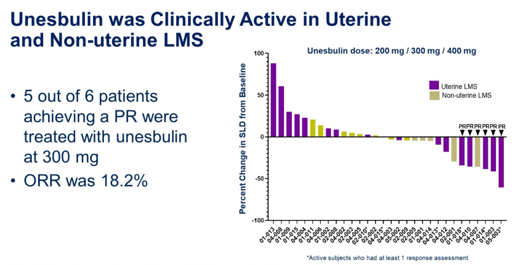 该研究结果表明,Unesbulin 300mg BIW联合达卡巴嗪1000mg/m2每21天的耐受性良好,在经过多线治疗的晚期LMS患者群体中显示出良好的疗效。计划进行一项随机、安慰剂对照的2/3期试验。