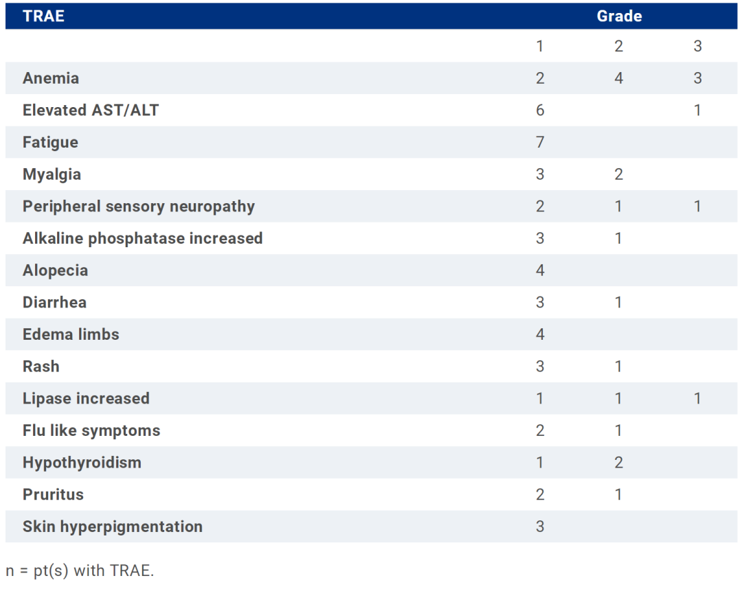 共有13名患者接受了治疗。组织学包括平滑肌肉瘤(6)、未分化多形性肉瘤(2)、去分化脂肪肉瘤(2)、多形性脂肪肉瘤(1)、血管肉瘤(1)和黏液纤维肉瘤(1)。下表按降序列出了发生率≥20%的治疗相关不良事件(TRAEs)。G3肾盂肾炎唯一观察到的剂量限制性毒性。一例患者(G3升高的AST/ALT)需要皮质类固醇干预并停止研究治疗。RP2D被确定为375 mg R加GD。R的低剂量和高剂量组的ORR分别为17%(1/6;95%CI:1-64%)和50%(3/6;95%CI:19-81%)。DCR为100%(6/6;95%CI:52-100%)和83%(5/6;95%CI:36-99%)。24周PFS发生率分别为60%(95%CI:29-100%)和44%(95%CI:17-100%)。