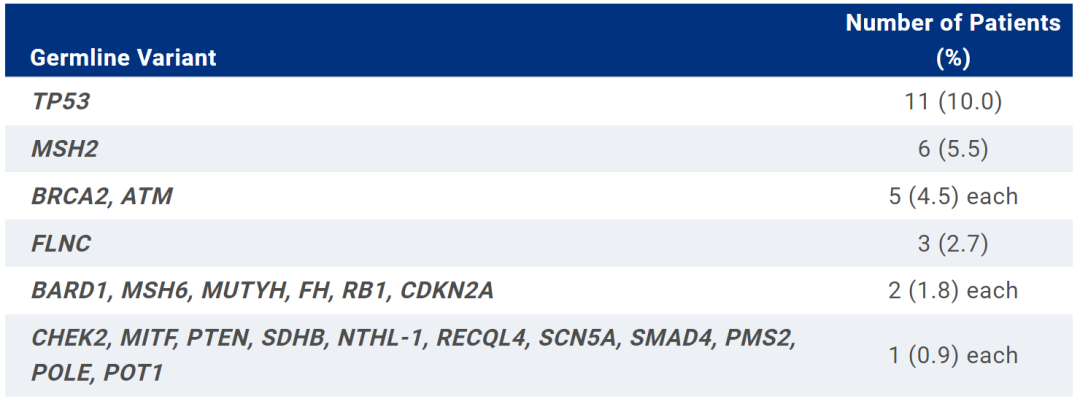 在回顾研究的15年间,有116例肉瘤患者接受了基因评估。这些患者多数有多发恶性肿瘤的个人病史(n=69,59.4%)、一级亲属(FDR)患有恶性肿瘤(n=67,57.7%)和诊断时较年轻(年龄≤18,n=18,15.5%)。48例(41.4%)患者既往有多种恶性肿瘤史且一级亲属有恶性肿瘤史。8例(6.9%)患者的一级亲属有肉瘤病史。在110名接受胚系检测的患者中,53名(48.2%)患者存在致病性/可能致病性胚系变异(PGV/LPGV)。下表中列出了已识别的胚系变异和频率。