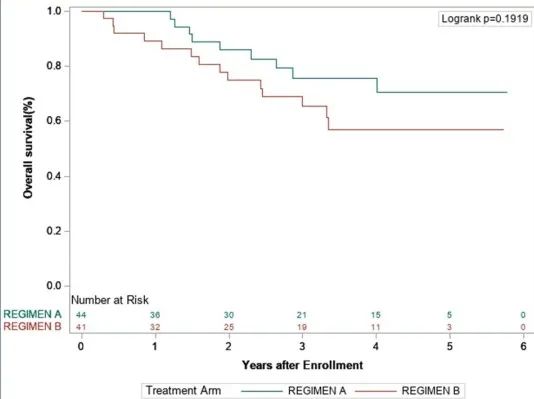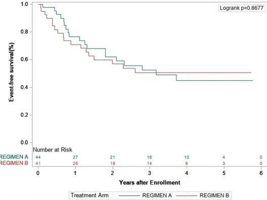 结果显示,85例符合入组条件的患者被纳入至化疗队列,并随机接受或不接受帕唑帕尼。中位年龄为22.1岁(范围:5.7-64.2岁);30例患者<18岁。最常见的组织学类型为滑膜肉瘤(42例)和未分化多形性肉瘤(19例)。截至2021 12月31日,在3.3年的中位随访中,ITT患者的3年无事件生存(EFS)率:方案A为52.5%(95%CI:34.8%-70.2%),方案B为50.6%(32%-69.2%)(P=0.8677);方案A和方案B的3年总生存(OS)率分别为75.7%(59.7%~91.7%)和65.4%(48.1%~82.7%)(P=0.1919)。