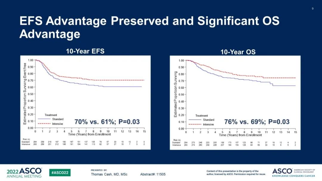 4、AEWS0031研究改进了对儿童局限性尤文肉瘤的化疗模式,将标准的3周方案压缩到2周方案。结果显示,在加强了化疗的密度后,患者获得更好的EFS和OS,且不会增加第二恶性肿瘤的发生。这个结果提示,对于化疗高度敏感的儿童软组织肉瘤,高强度、足剂量、高密度的化疗仍然是保证治疗效果的最重要的治疗方式。