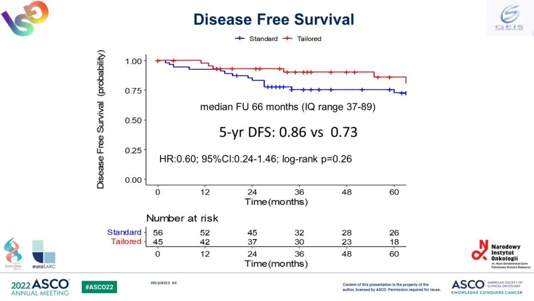 ISG、GEIS、FSG和PSG对术前3周期表阿霉素+异环磷酰胺(EI)对比组织学定制(HT)方案用于选定的、局限性高危STS新辅助治疗的随机试验表明,EI在所有组织学中都具有一定优势,但黏液样脂肪肉瘤(MLPS)除外,其中EI和HT方案似乎是等效的(J Clin Oncol 2020;38:2178-86)。该MLPS队列进行了扩展,目的是评估HT(曲贝替定)方案与EI方案相比的非劣效性。主要终点是无病生存期(DFS)。次要终点是总生存期(OS)。