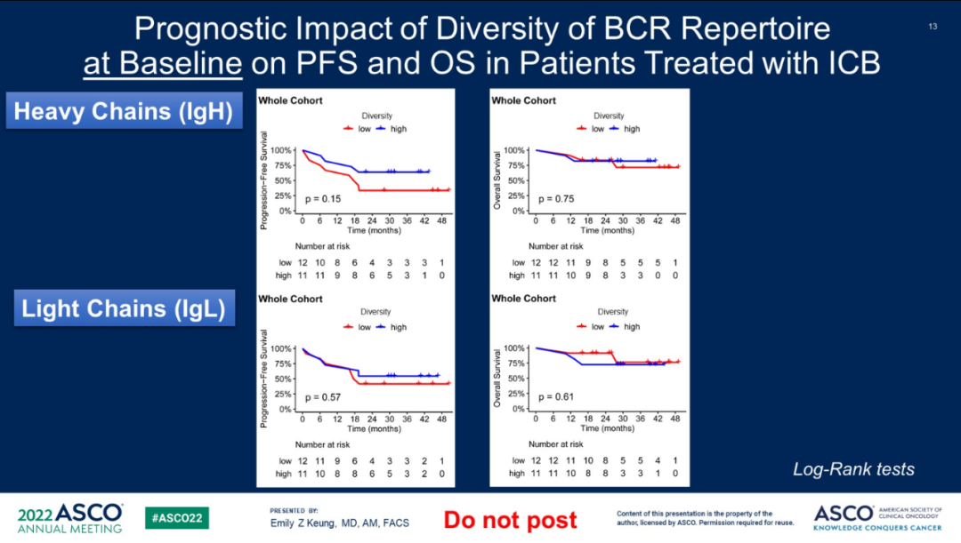截至2022年2月28日,所有患者从ICB治疗开始至少随访2年。计算无进展生存期(PFS)和总生存期(OS),评估病理缓解(术后病理的玻璃样变百分比和存活肿瘤)与PFS、OS的相关性。对治疗前后的活检标本进行肿瘤内BCR序列测定,按照中位值分为高和低BCR。