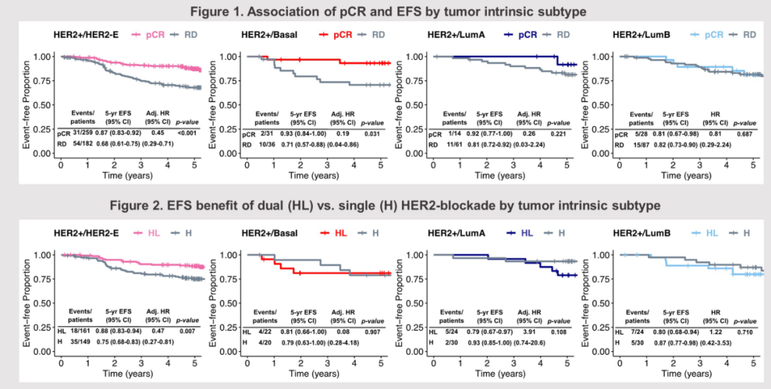 研究对761例样本进行了基因测序(CALGB 40601的264份,NeoALTTO的249份,NSABP B-41的248份),对内在亚型及759个基因位点进行分析,同时检测不同内在亚型抗HER2治疗联合方案(曲妥珠单抗联合奈拉替尼)与单药方案(曲妥珠单抗)在pCR率及预后方面的相关性。该研究发现,仅在HER2富集型(HER2-Enriched)(HR 0.45,95%CI:0.29~0.71,P<0.001)以及Basal-like(HR 0.19,95%CI:0.04~0.86,P=0.031)这两种内在亚型乳腺癌患者中,pCR作为EFS的预测指标具有显著意义。联合抗HER2治疗组与单药抗HER2治疗组的EFS获益仅限于HER2富集型这一内在亚型(HR 0.47,95%CI:0.27~0.81,P=0.007)。