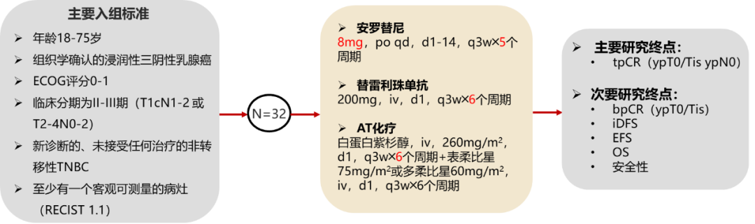 该研究是一项前瞻性、开放、单臂、单中心的Ⅱ期临床研究。符合条件的患者是18-75岁的女性、ECOG状态0-1、新诊断的、既往未经治疗的经组织学确诊的浸润性TNBC(T1cN1-2或T2-4N0-2)。符合条件的患者接受5个周期的低剂量安罗替尼(8mg,口服,第1~14天每天1次,每21天重复1次)联合6个周期的替雷利珠单抗(200mg,静脉注射,第1天,每21天重复1次)及AT化疗方案(紫杉类:白蛋白紫杉醇260mg/m2,静脉注射,第1天,每21天重复1次;蒽环类:表柔比星75mg/m2或多柔比星60mg/m2,静脉注射,第1天,每21天重复1次),随后进行手术。