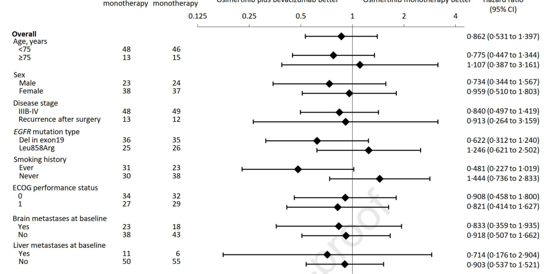 亚组分析发现,携带19del的患者,HR=0.62,携带21L858R突变的患者,HR=1.25,基线有脑转移的患者HR=0.83,基线无脑转移的患者HR=0.91。接受联合治疗组的患者瘤体均出现缩小,但接受单药治疗的患者,有1例出现瘤体增大,两组ORR分别为86%和82%,中位DOR分别为17.6个月和22.9个月。数据分析时,两组均有30%的患者出现OS事件,中位OS尚不成熟。