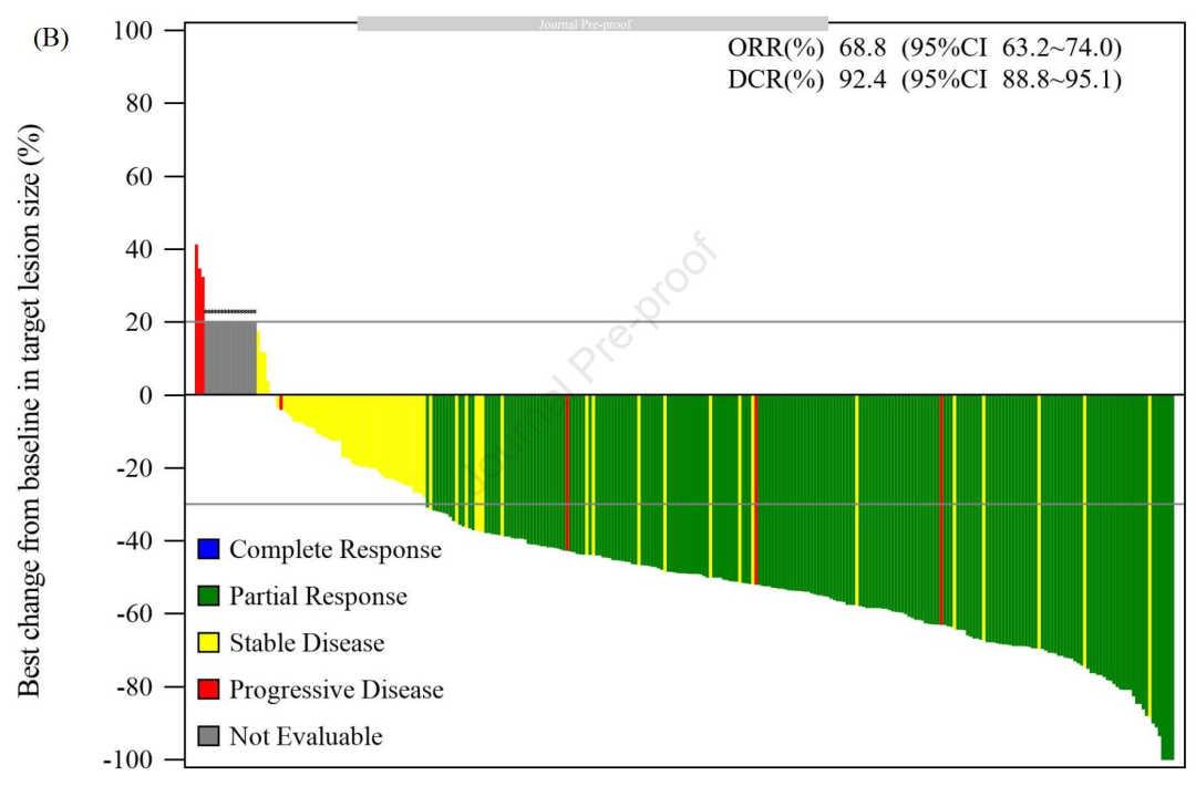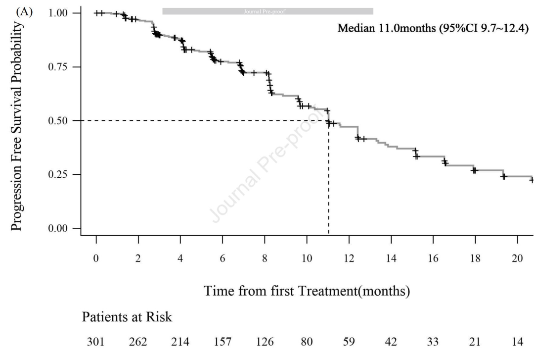 40.1%的患者出现疾病进展或死亡事件,中位DOR为11.1个月,12个月响应持续率为46.3%,中位PFS为11.0个月,12个月PFS率为47.1%,12个月OS率为72.9%,91.7%的患者均出现瘤体缩小,82例患者因不良反应而导致剂量降低。接受标准剂量及减量治疗的患者,ORR分别为76.8%和65.8%,中位PFS分别为15.2个月和11.0个月。