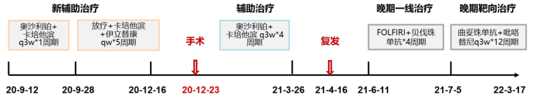 2021-1-18第一周期于复旦大学附属医院治疗;2021-2-7、2021-3-3、2021-3-26于河北医科大学第四医院治疗,用药方案为:奥沙利铂+卡培他滨 q21d ,共4周期(奥沙利铂 200mg+卡培他滨1.5g 2/日 d1-14)。无明显不良反应。
