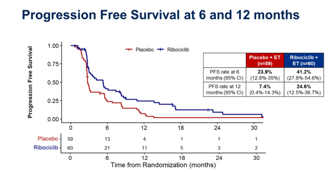 Kevin Kalinsky教授:MAINTAIN研究是一项随机对照试验,研究入组对象为HR+/HER2-晚期乳腺癌患者,这些患者至少都经过一种CDK 4/6抑制剂治疗和任何一种内分泌治疗后出现疾病进展。该研究共入组了120例患者,并将患者按照1:1比例进行分配,给予内分泌联合瑞博西利(ribociclib)治疗或内分泌联合安慰剂治疗。
