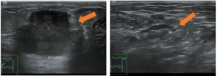 右乳10点方向腺体层探及一实质低回声肿块,大小约35.1×22.6mm,内部回声不均匀,其内可探及多个点状强回声,边界不清,形态不规则,周边可见毛刺征,CDFI、CDE示其内血供丰富。右侧腋窝探及多个实质低回声结节,大者约10.2×5.2mm,皮质稍增宽,CDFI、CDE示其内血供不丰富。