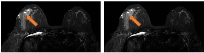 (3 cycle 后)2021.9.22 复查乳腺MRI示:右乳肿块较前减小14mm×9mm×18mm。