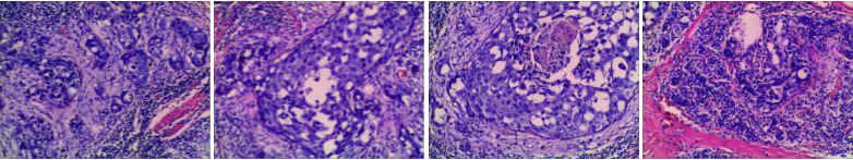本例是一位年轻的乳腺癌患者,经穿刺右乳肿物确诊为HER2阳性型,虽然遗憾的是右腋窝淋巴结未行穿刺,但根据乳腺超声、钼靶及乳腺MRI,腋窝淋巴结转移的可能性较大,首诊右乳癌cT2N1M0 Ⅱb期,根据CSCO、NCCN等指南推荐,建议此患者进行新辅助化疗,推荐方案为TCbHP或THP,考虑患者较年轻,后续生存质量及可能会有生育要求,建议其化疗前使用OFS保护卵巢,患者拒绝。结合患者肿瘤类型及自身情况,为患者选择了双靶联合单药化疗THP方案,其中H为国产曲妥珠单抗汉曲优,经过两个周期的新辅助化疗后,患者自我感觉及乳腺超声均提示右乳肿物明显缩小,大大增强了患者战胜癌症的信心,第三周期化疗后全面复查,临床查体右乳外上象限肿物体表无法触及,影像学乳腺超声、钼靶及乳腺MRI评估提示右乳肿物明显缩小,右腋窝肿大淋巴结明显缩小,消失。由于患者出现了化疗后重度骨髓抑制,虽然经处理好转,但患者拒绝继续按原计划行新辅助化疗6周期,要求手术治疗。于2021.9.23全麻下行右乳癌改良根治术,可喜的是,病理结果提示右乳癌肿达到了完全病理缓解。
