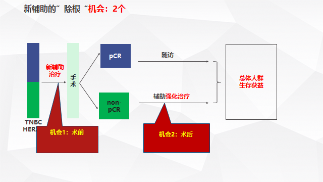 时代进步,当今的新辅助策略提供2次“除根”的机会(见图6),一次就是术前新辅助化疗本身。在前面的内容中已经花了大量笔墨谈如何设计术前新辅助方案,在此不再赘述。下面重点谈一下为什么要“顾后”。