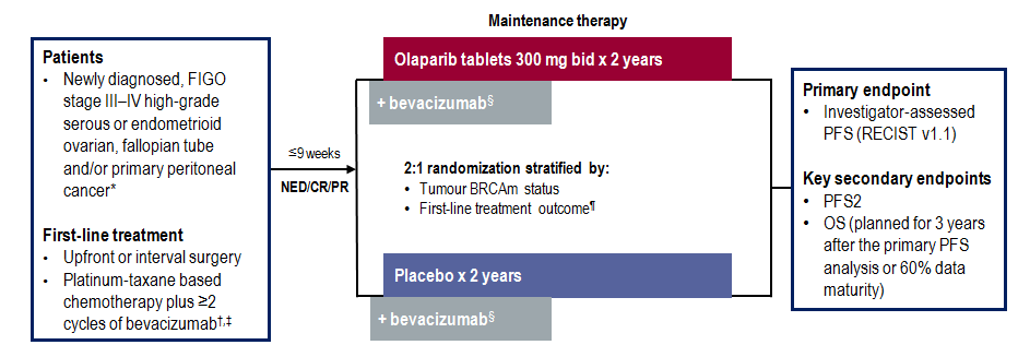 在随机、双盲、国际III期PAOLA-1/ENGOT-ov25试验中,患者以2:1的比例随机接受每天两次300mg奥拉帕利片剂(n=537)或安慰剂(n=269),最多24个月。所有患者每3周接受15mg/kg贝伐珠单抗,持续15个月。无进展生存期(PFS)作为主要终点。次要终点包括至第二次进展的时间(PFS2)和OS。试验入组要求患者具有新诊断为国际妇产科联合会(FIGO)III-IV期、高级别浆液性卵巢癌或卵巢子宫内膜样癌、输卵管癌和/或原发性腹膜癌,并对一线铂/紫杉烷化疗+贝伐珠单抗治疗有应答。一线治疗包括初次或间期细胞减灭术和以铂/紫杉烷为基础的化疗+≥2周期贝伐珠单抗治疗。无论手术结果或BRCA突变状态如何,患者都符合入组条件。
