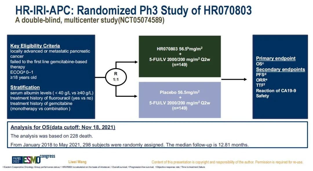 本研究自2018年1月至2021年5月共纳入了298例一线吉西他滨治疗失败的局部晚期或晚期胰腺癌患者,研究1:1随机入组,分别接受 HR070803+5-FU/LV方案或安慰剂+5-FU/LV 方案治疗,直至疾病进展或不耐受。主要研究终点为总生存期(OS),次要研究终点包括无进展生存期(PFS)、客观缓解率(ORR)、安全性等。中位随访时间为12.81个月,OS 数据分析截止至2021年11月18日。