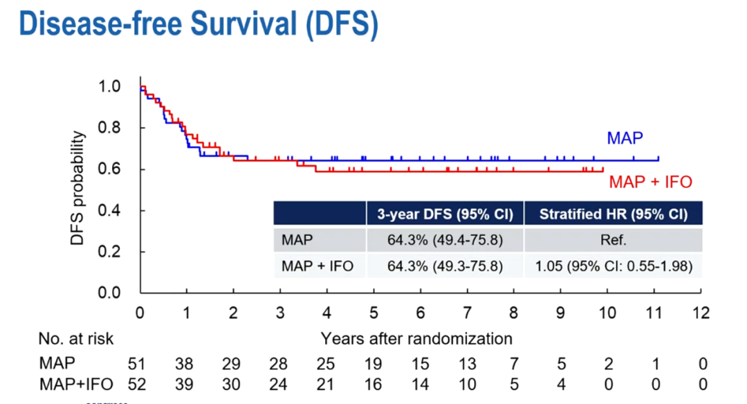 结果:2010年2月至2020年8月共入组287例患者,最终分别有51例和52例患者随机接受MAP或MAP+IF治疗。在2022年3月的第二次中期分析中,MAP的3年DFS率为64.3%(95%CI:49.4~75.8),MAP+IF为64.3%(49.3~75.8)(HR 1.05,95%CI:0.57~1.91)。MAP的3年OS率为86.5%(72.4~93.7),MAP+IF为78.8%(64.1~88.0)(HR 1.48,0.68~3.22)。两组均无治疗相关死亡。MAP+IF有9例患者因不良事件终止方案治疗,而MAP中没有。基于分析结果,JCOG的数据和安全监测委员会建议终止该研究,因为HR估计值高于预设的HR 1.0。