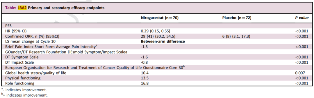 DeFi :Nirogacestat与安慰剂治疗进展性硬纤维瘤(DT)的III期随机对照试验(摘要号:LBA2)