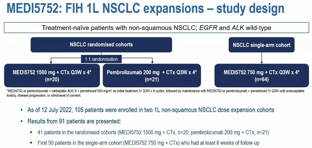 这项研究纳入初治的EGFR/ALK野生型非鳞NSCLC患者,随机分配至每3周接受1500mg MEDI5752或帕博利珠单抗联合培美曲塞/卡铂4个周期,随后维持MEDI5752或帕博利珠单抗联合培美曲塞治疗,直至出现不可接受的毒性、疾病进展或撤回同意。