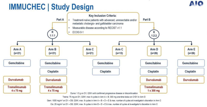 IMMUCHEC研究属于前瞻性、多中心、随机、“概念验证性研究(proof-of-concept study)”,在德国16家中心纳入了138例患者以评估曲美木单抗(T)和度伐利尤单抗(D)联合化疗疗效,纳入成人、ECOG 0~1、病理确诊的转移性BTC或胆囊癌。主要研究终点是依据RECIST1.1评估的初治患者的ORR;次要终点是OS、PFS和安全性;探索性分析包括试验治疗组的综合疗效和安全性分析。